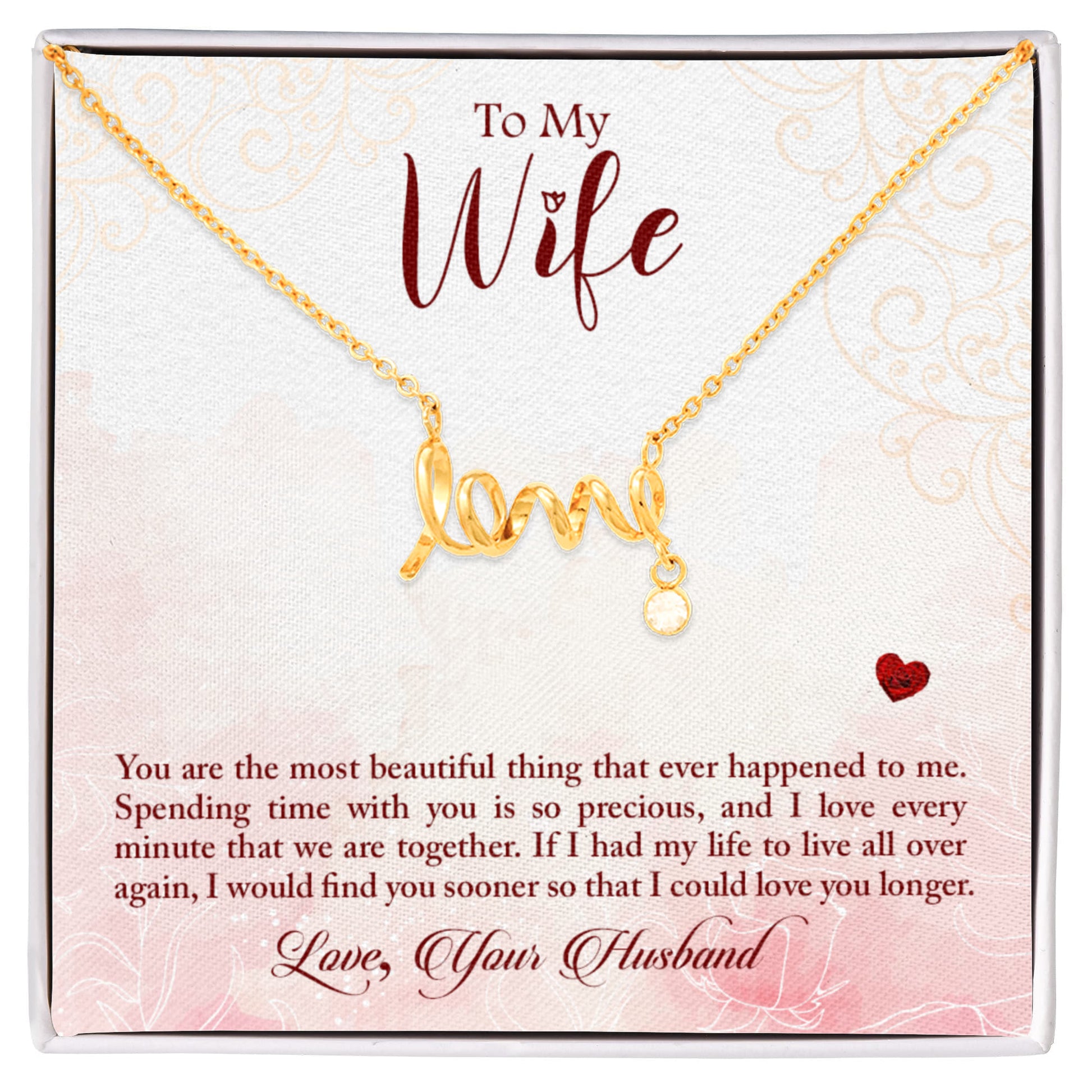 This beautiful scripted love necklace says what words often can’t, giving your wife a timeless reminder of your unwavering love, loyalty, and appreciation.